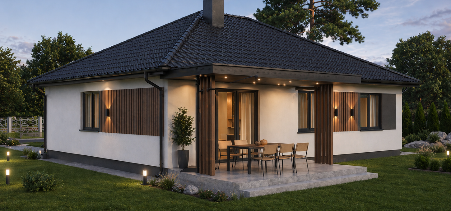 Przestronny salon płynnie przechodzi w jadalnię i kuchnię, tworząc serce domu, gdzie zaczyna się każdy poranek i kończy każdy wieczór. Trzy sypialnie dają każdemu swój kąt. Osobna kotłownia, schowek i toaleta dla gości sprawiają, że dom działa sprawnie — bez kompromisów między wygodą a estetyką.