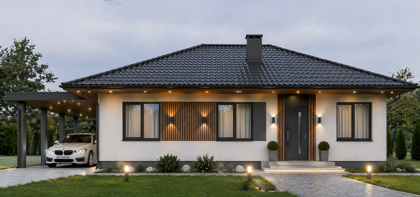 Nowoczesna bryła z czystymi liniami fasady — dom, który dobrze wygląda dziś i będzie dobrze wyglądał za dwadzieścia lat.
