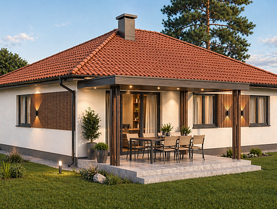 szukasz praktycznego domu dla rodziny z jednym lub dwójką dzieci, zależy Ci na wygodnym rozkładzie bez schodów i zbędnych korytarzy, chcesz nowoczesnego wyglądu bez niepotrzebnej architektury, i wiesz, że 108 m² dobrze rozplanowane wystarczy — i nie trzeba płacić za metry, których się nie używa.